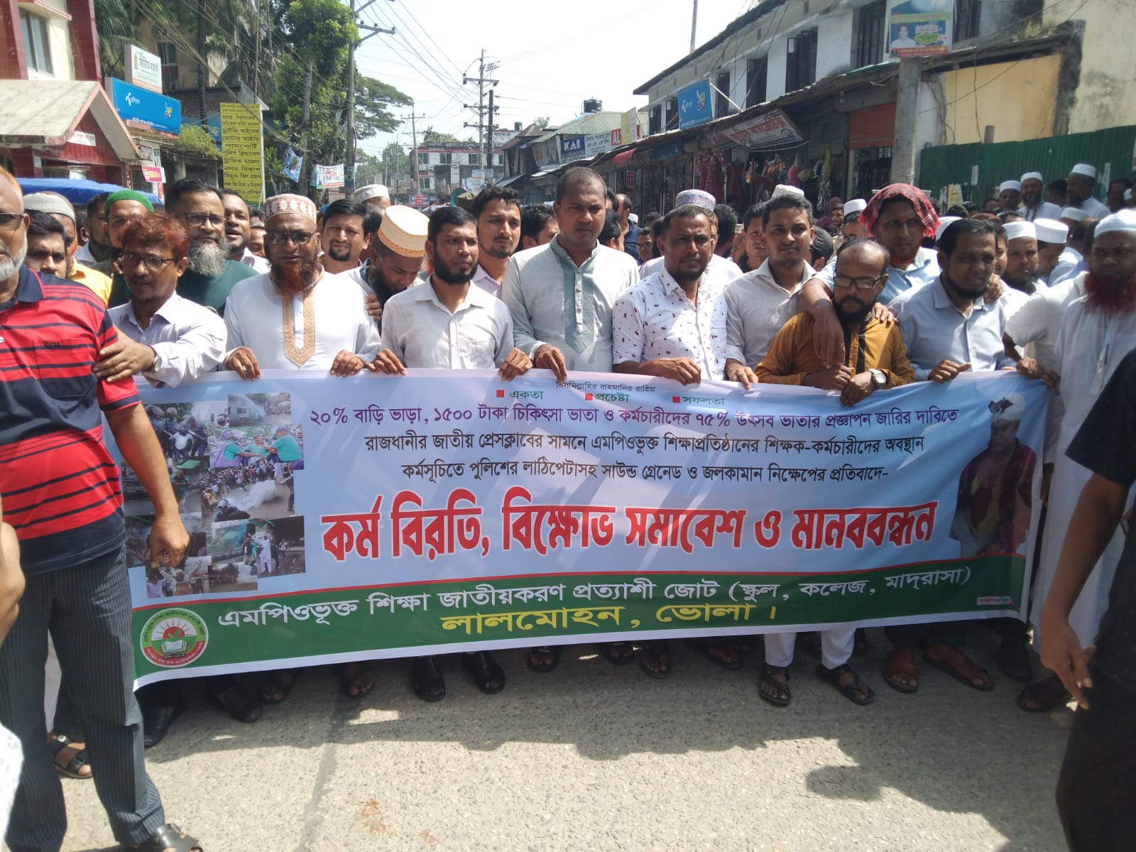 জাহিদ দুলাল, ভোলা দক্ষিণ : জাতীয় প্রেসক্লাবের সামনে এমপিওভুক্ত শিক্ষক-কর্মচারীদের অবস্থান কর্মসূচিতে পুলিশের লাঠিপেটাসহ সাউন্ড গ্রেনেড ও জলকামান নিক্ষেপের প্রতিবাদে ভোলার লালমোহন উপজেলায় কর্মবিরতি, বিক্ষোভ সমাবেশ ও মানববন্ধন অনুষ্ঠিত হয়েছে। মঙ্গলবার সকাল ১১ টায় উপজেলা এমপিওভুক্ত শিক্ষা জাতীয়করণ প্রত্যাশী জোটের (স্কুল, কলেজ, মাদরাসা) উদ্যোগে লালমোহন বালিকা মাধ্যমিক বিদ্যালয় থেকে বিক্ষোভ মিছিল শুরু করে শহরের প্রধান প্রধান সড়ক প্রদক্ষিণ করে চৌরাস্তার মোড়ে গিয়ে শেষ হয়। সেখানে ঘন্টাব্যাপী মানববন্ধন অনুষ্ঠিত হয়। এতে বিভিন্ন শিক্ষাপ্রতিষ্ঠানের কয়েক হাজার শিক্ষক-শিক্ষার্থী ও অভিভাবকরা অংশগ্রহণ করেন।