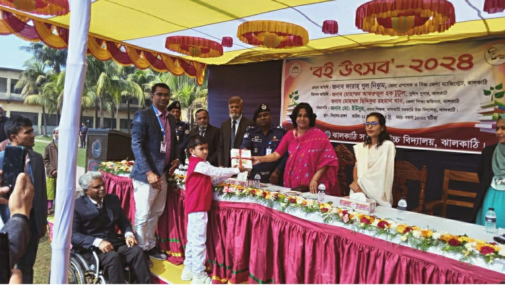 ঝালকাঠিতে উৎসবমূখর পরিবেশে শিক্ষার্থীদের মাঝে নতুন বছরের পাঠ্য বই বিরতণ