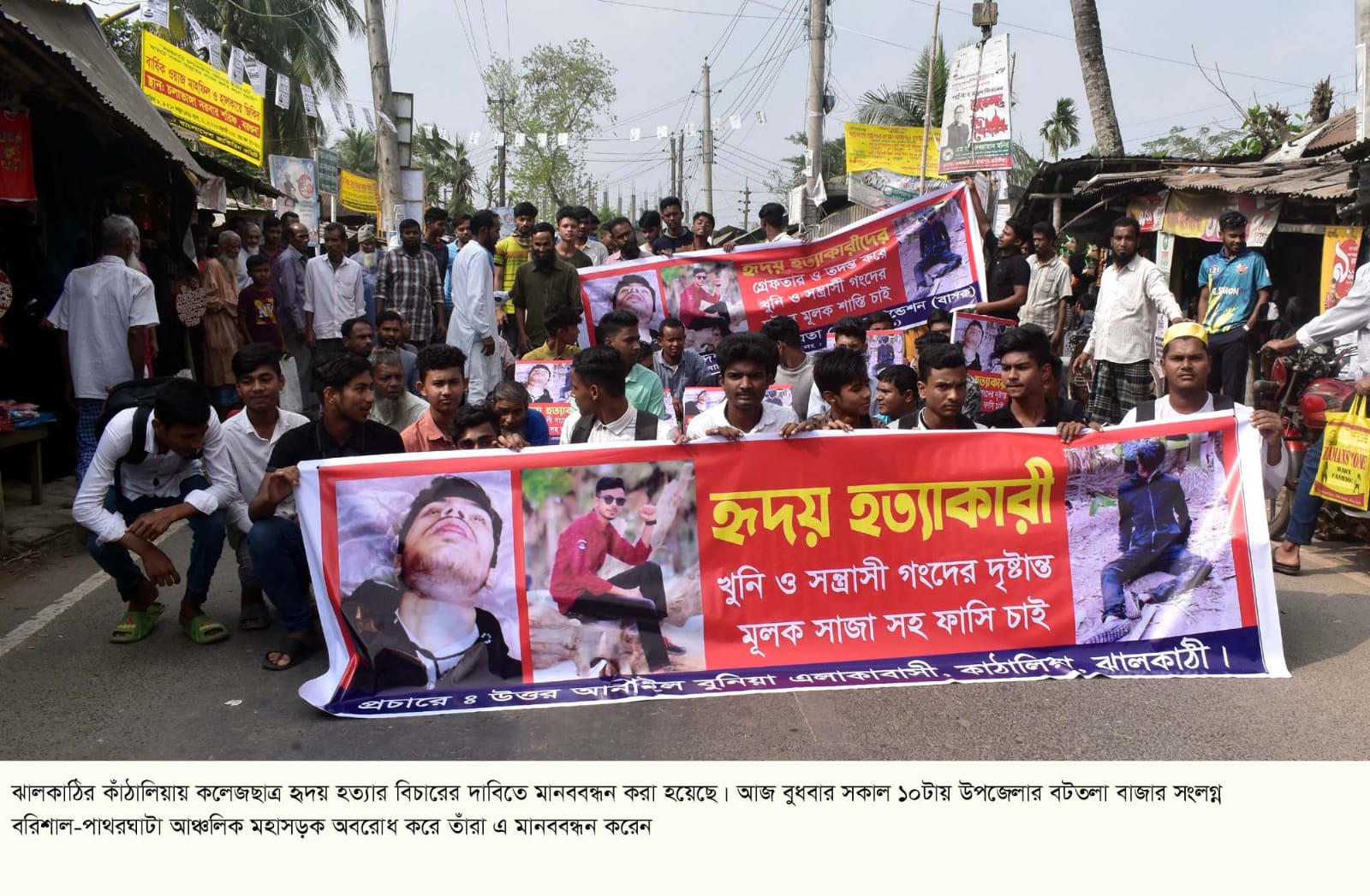 ঝালকাঠি প্রতিনিধি: ঝালকাঠির কাঠালিয়ায় কলেজছাত্র হৃদয় হত্যার বিচারের দাবিতে মানববন্ধন করা হয়েছে।